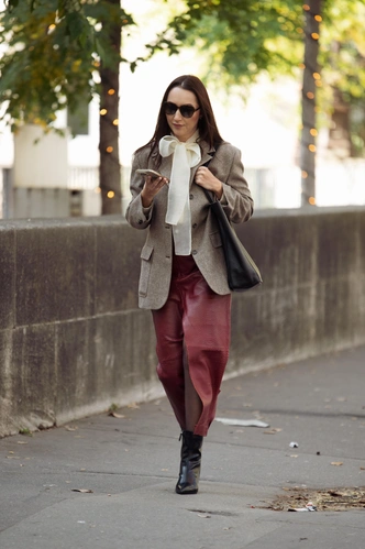 У любой блузы с бантом есть типичная проблема: в паре с узкой юбкой и лодочками она мгновенно превращается в офисный дресс‑код. Чтобы этого избежать, сначала убираем привычное «окружение» — никаких костюмных моделей, узких брюк и мелкого жемчуга. Вместо этого стоит отдавать предпочтение прямым джинсам с высокой посадкой, кожаным расслабленным юбкам, а также не забывайте чуть расстегивать верхние пуговицы блузы и завязывать бант так, чтобы он мягко прикрывал декольте, но не перетягивал шею.