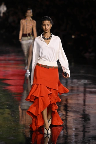 На подиуме особенно запомнились томатные миди‑юбки: у французских брендов — в паре с лаконичными топами и структурными жакетами, у других Домов — с более расслабленным верхом, но с тем же ощущением «модной решимости» в каждом шаге. Этот оттенок будто создан для того, чтобы взять на себя всю работу по образу: он одновременно теплый и насыщенный, не уходит в агрессию, но и не дает затеряться в толпе.