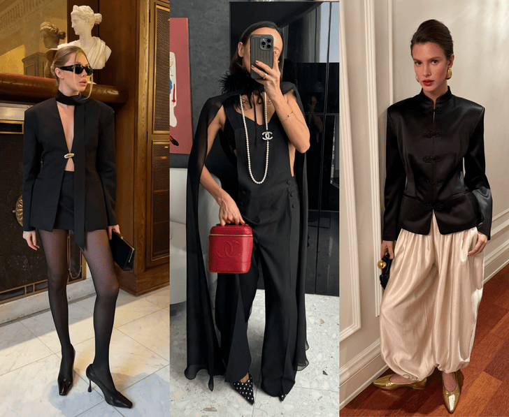 Как избежать: добавляйте в черный образ контрастные или яркие акценты — будь то блестящие украшения, фактурные материалы (например, бархат или кожа), необычные силуэты или смелые аксессуары. Играйте с объемом и слоями, комбинируйте матовые и глянцевые фактуры, чтобы черный заиграл многогранностью и стал настоящей звездой праздничного аутфита.