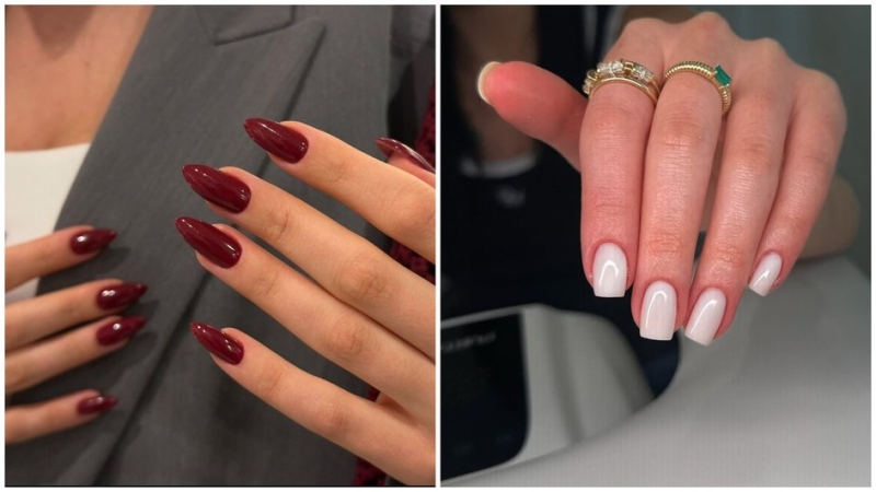 Лучше всего бордовые и винные тона смотрятся на коротких ногтях овальной или миндалевидной формы — там цвет выглядит плотным и аккуратным. На длинных ногтях важно следить за ровным покрытием, иначе оттенок теряет благородство. Из дизайна достаточно простых акцентов: матовое покрытие, минимальная золотая полоска или градиентный кончик.
