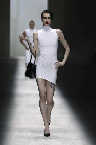 Однако дальше коллекция вдруг пошла на усложнение. На подиуме стали мелькать оммажи Тому Форду. К слову, отсюда и невероятно худые модели, ведь эпоха экс-дизайнера Gucci пришлась аккурат на эру «героинового шика», когда размер XS был эквивалентом привлекательности. Да и сам Демна, не будем лукавить, не раз приглашал на свои презентации самых стройных манекенщиков. И хотя для этой коллекции, по собственному признанию, он вдохновлялся «Рождением Венеры», будет справедливо заметить, что стандарты красоты Ренессанса явно отличались от тех, что он представил сейчас.