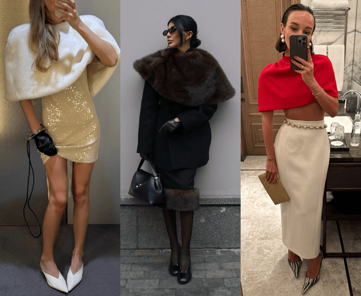С пальто укороченные меховые кейпы работают как эффектный акцент и дополнительный утепляющий слой. Это тот случай, когда функциональность и стиль идут рука об руку: вы реально теплее одеты и при этом выглядите как модель с модного подиума. С куртками и пуховиками лучше всего сочетаются костюмные кейпы — они собирают объемный верх и делают образ более структурным, а с классическими пальто — меховые асимметричные модели. Дополнительно поддержите цвет кейпа аксессуарами в тон или поиграйте в классику — монохромные тотал-луки всегда выглядят дороже.