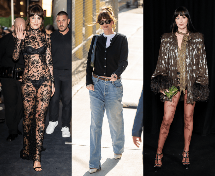 Кружевные наряды, боди и «голые» платья Дакоты почти всегда уравновешены простым силуэтом, закрытым или аккуратным вырезом и минимумом украшений, поэтому в них читается не желание шокировать, а уверенность в себе и свобода.