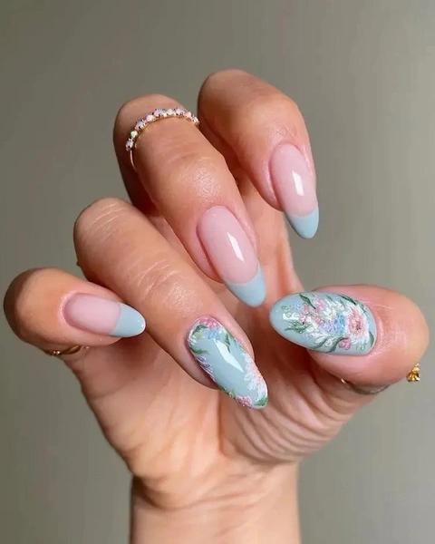 Кстати, цветочный френч этой весной может быть не только с белой улыбкой. В последнее время набирают популярность цветные французские маникюры, где линия френча выполнена в нежных оттенках — персиковом, лавандовом, мятном, и уже поверх нее или вместо нее располагаются цветочные мотивы. Получается еще более нежный и чуть более современный вариант, который отходит от строгой классики, но сохраняет ее узнаваемую структуру.