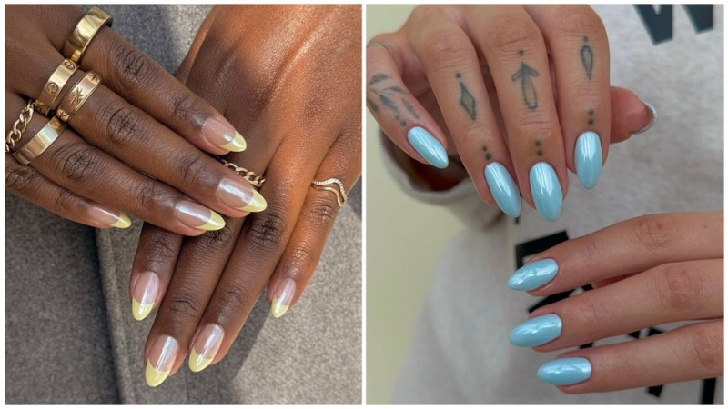 Тренд на глянцевый маникюр появился пару лет назад благодаря Хейли Бибер и моментально стал вирусным. Перламутровое покрытие с хромовым блеском смотрится свежо на любой базе — от нюда до насыщенных цветов — и делает маникюр визуально сложнее без лишних деталей.