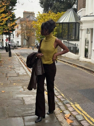 Лондонские инфлюенсеры все чаще собирают тотал‑луки в pale yellow и разбавляют их аксессуарами в шоколадных и карамельных оттенках.