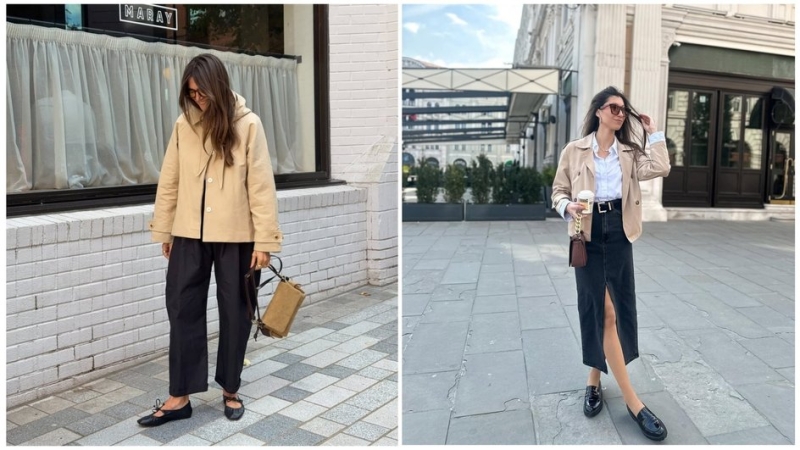 Для такого образа лучше всего подходят короткие тренчи прямого или слегка свободного кроя — без лишнего объема в плечах и с аккуратной линией талии. Хорошо смотрятся модели с поясом или четкой линией низа: они подчеркивают силуэт.