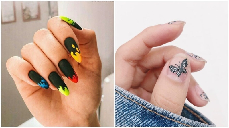Интересно смотрятся и фантазийные мотивы: галактики, звёздные карты, силуэты бабочек, абстрактные завитки. Черный усиливает их графику и помогает сохранить баланс между яркостью и элегантностью. Такой маникюр становится главным акцентом образа и подчеркивает индивидуальность.