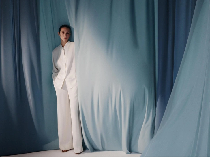 Среди моделей — блузка с высоким воротником и свободные брюки, которые хорошо держат форму. Лаконичные и простые, оба изделия создают комфортный закрытый силуэт без лишних деталей. Для комплекта Alice Blue был выбран шелк серо-голубого оттенка, напоминающий мираж в жаркой пустыне. Этот материал приятно скользит по коже, создавая ощущение легкой прохлады и невесомости. Комплект также доступен в цвете Ecru — это оттенок необработанного шелка, близкий к молочному. Такие образы выглядят торжественно, но не перегружено, поэтому их можно стилизовать как для дневных, так и для вечерних мероприятий.