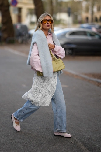 Есть и одно общее правило, которое экономит время — чем милее сама обувь, тем взрослее должны быть вещи вокруг. Лакированный носок, банты, стразы и сатин лучше всего чувствуют себя в компании структурированных жакетов, лаконичных платьев-футляров и строгих сумок, а не кружевных гольфов и школьных плиссе. Если страшно переборщить с инфантильностью, спасают спортивные детали — винтажный бомбер, парка с карманами или утилитарная сумка через плечо, которая заземляет образ и возвращает его из комедийного сериала про школьниц в реальный мир.