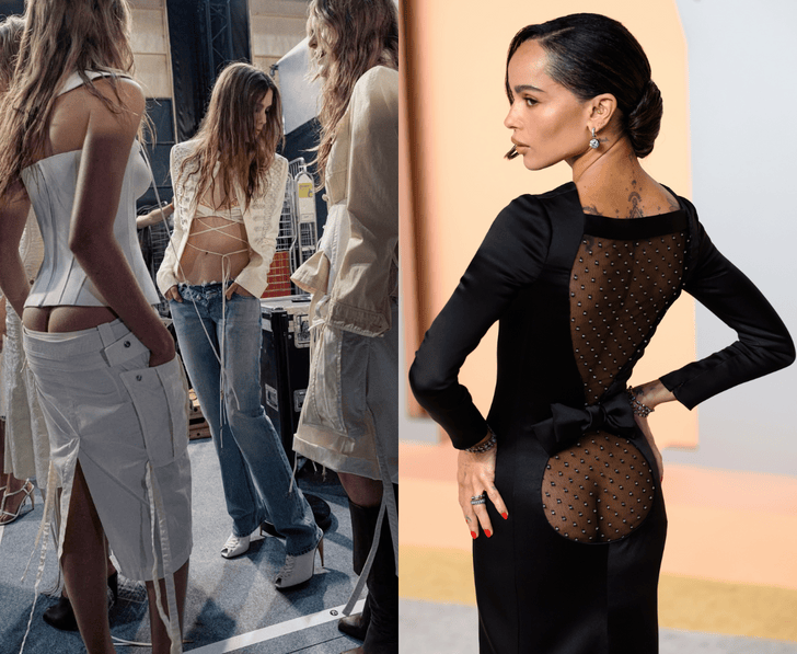 Тот же тренд поддержала Зои Кравиц на вечеринке Vanity Fair в уже таком далеком 2025 году: ее платье Saint Laurent с прозрачной спиной, доходящей до верхней части ягодиц, моментально разошлось по социальным сетям. Кстати, акцентом в образе опять стал бантик. Может, это более безопасный способ оголить себя и показать миру, что несмотря на дерзость и бунтарскую натуру, я все еще остаюсь милой девушкой.