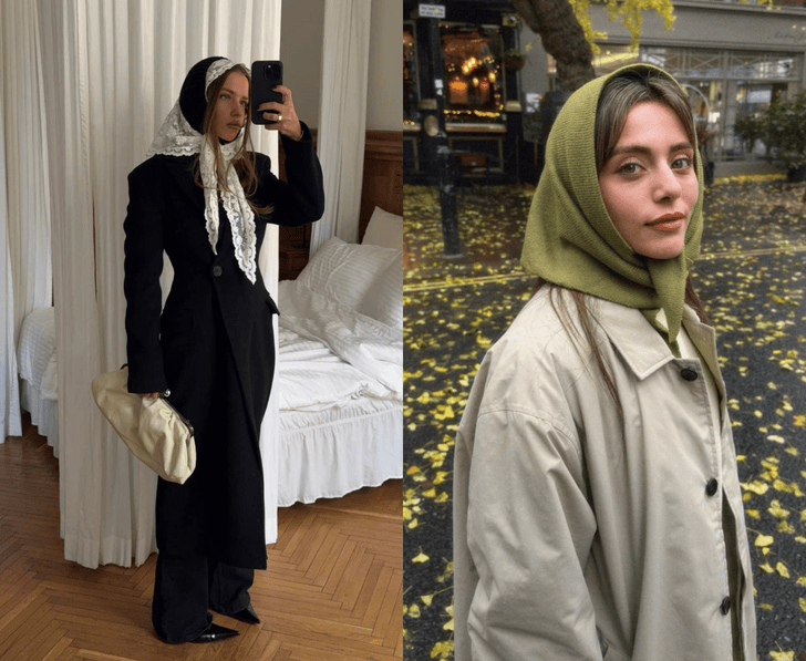 Особенно красиво смотрятся комбинация «косынка + оверсайз‑свитер + офисные брюки». Здесь головной убор «сглаживает острые углы» строгих штанов и делает силуэт более живым .