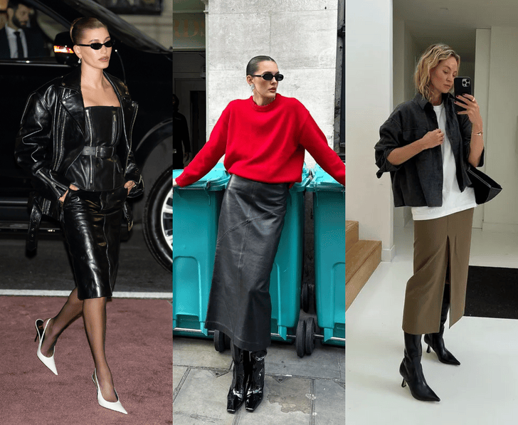 Для вечерних выходов и светских мероприятий подойдут кожаные или атласные модели: они выглядят дороже за счет интересного материала, а еще поддерживают тренд на «роковую женственность» в духе femme fatale. Выбирайте варианты с разрезом спереди или сбоку — так в них будет удобнее ходить (читать: «покорять сердца»), а образ получится более динамичным.