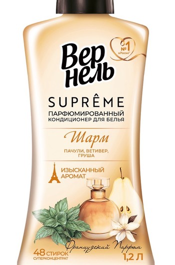 Каждый многогранный аромат создавался совместно с французскими парфюмерами специально для Вернель, что делает их поистине неповторимыми. Также для новых кондиционеров был разработан премиальный атласный дизайн с изображением на упаковке ингредиентов, составляющих пирамиду аромата. Кондиционеры Вернель Supreme с парфюмированными отдушками дарят белью невероятную мягкость и изысканный аромат.